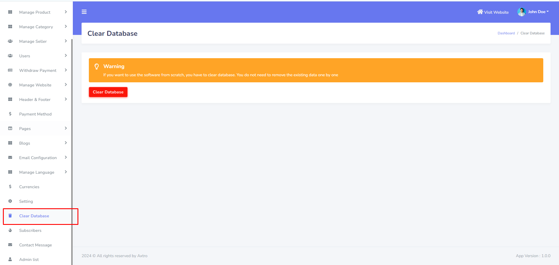 If admin want to use the software from scratch, he can click here to reset the database. He do not need to remove the existing data one by one. Go to "Setting >> Database Clear" from sidebar. See: