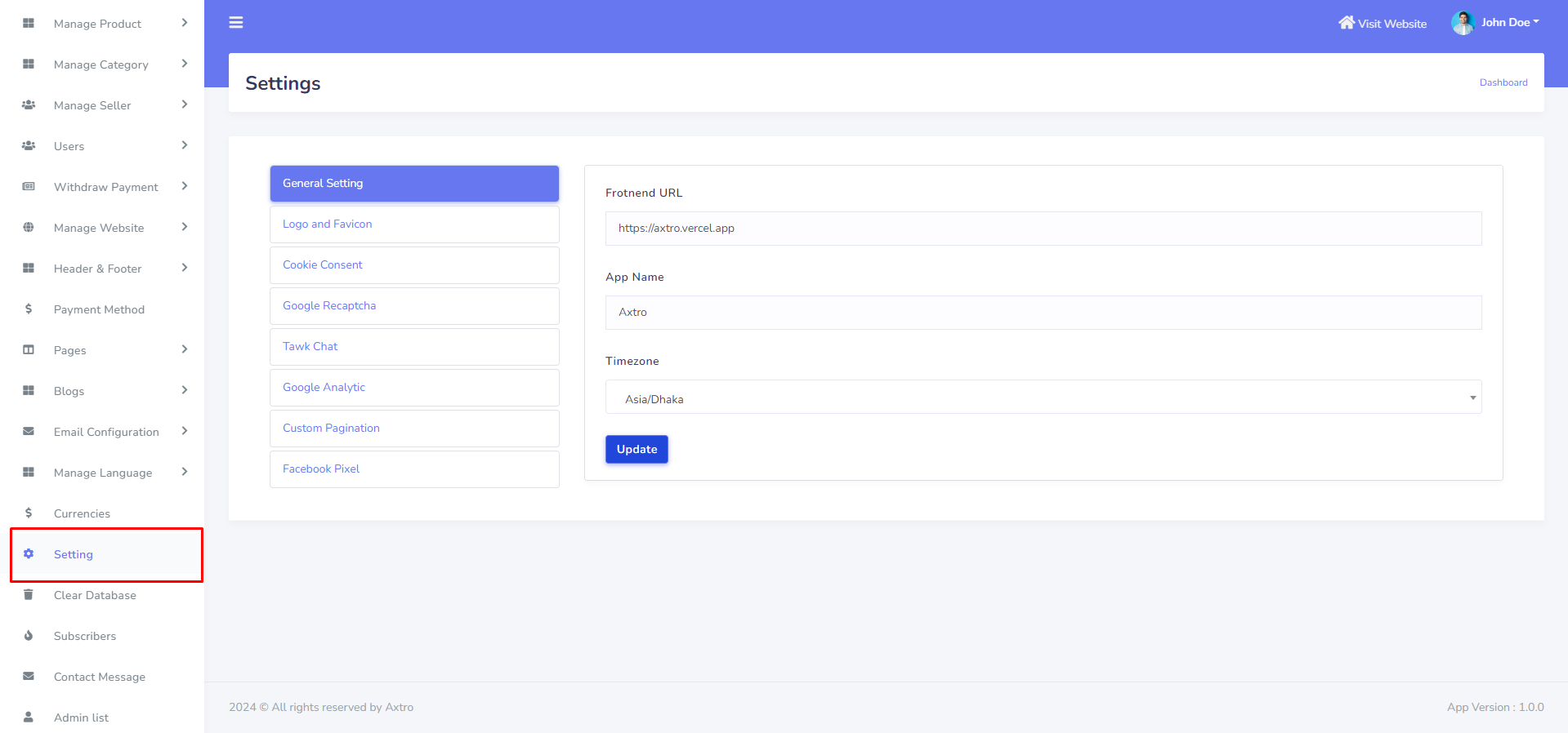 Website General Setting can be set up from the admin panel. In this section admin can be change App Name, Timezone, Frontend etc. Go to "Setting >> General Setting". See: