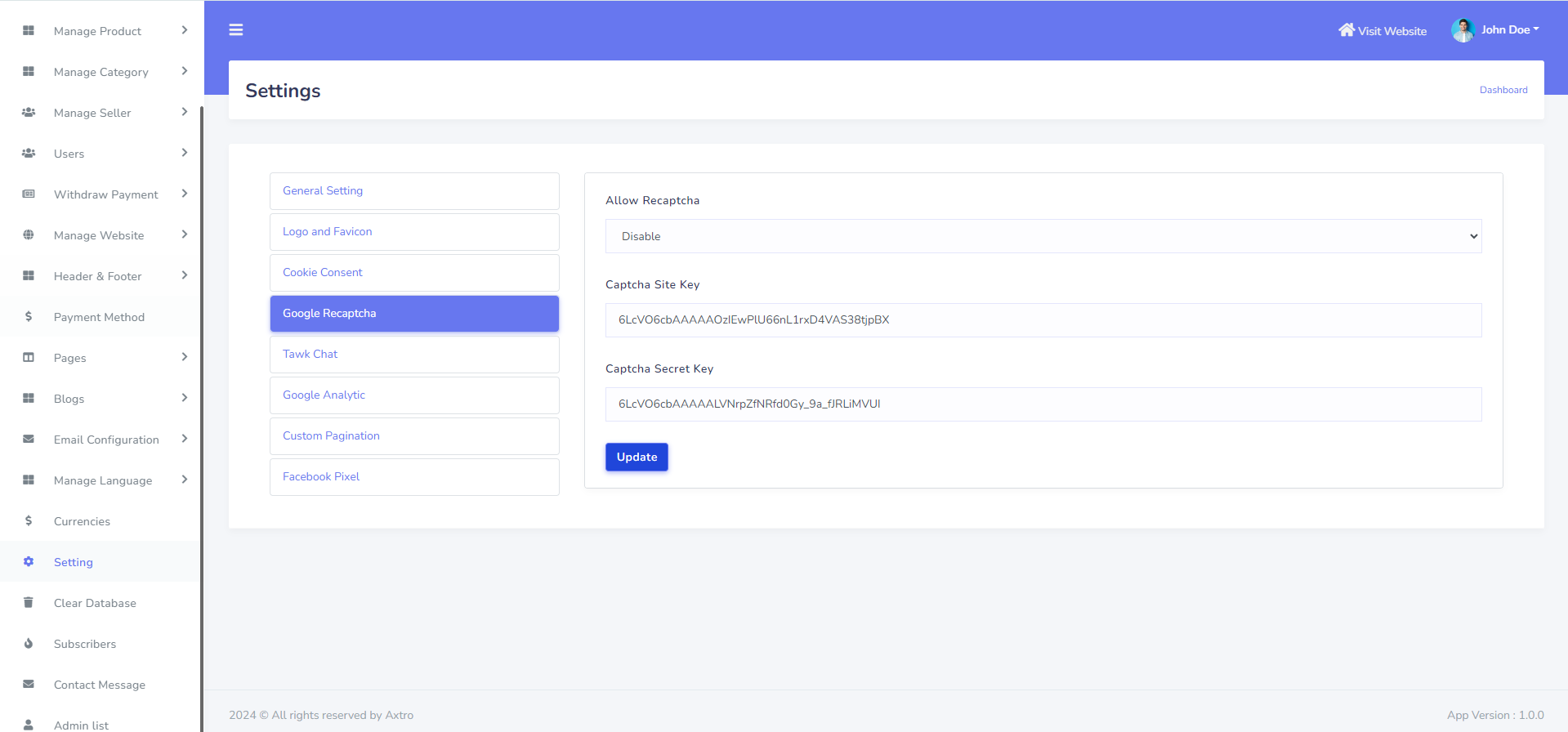 Google Recaptcha can be set up from the admin panel. Go to "Setting >> Google Recaptcha" from the sidebar. See: