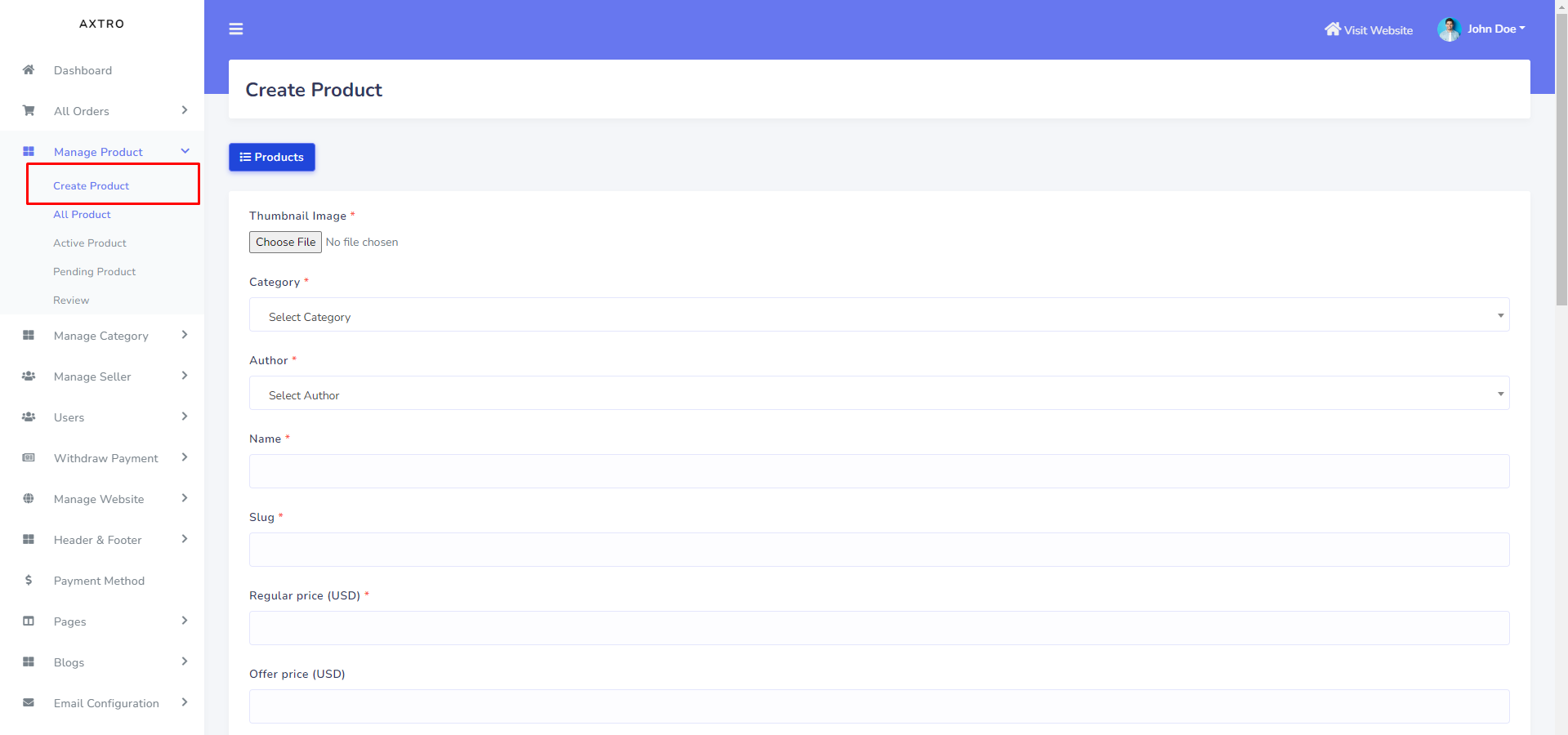 In this section admin can be manage the product. he can add new product, he can make featured product. He can also approval seller product request. To create new product go to "Manage Product >> Create Product". See: