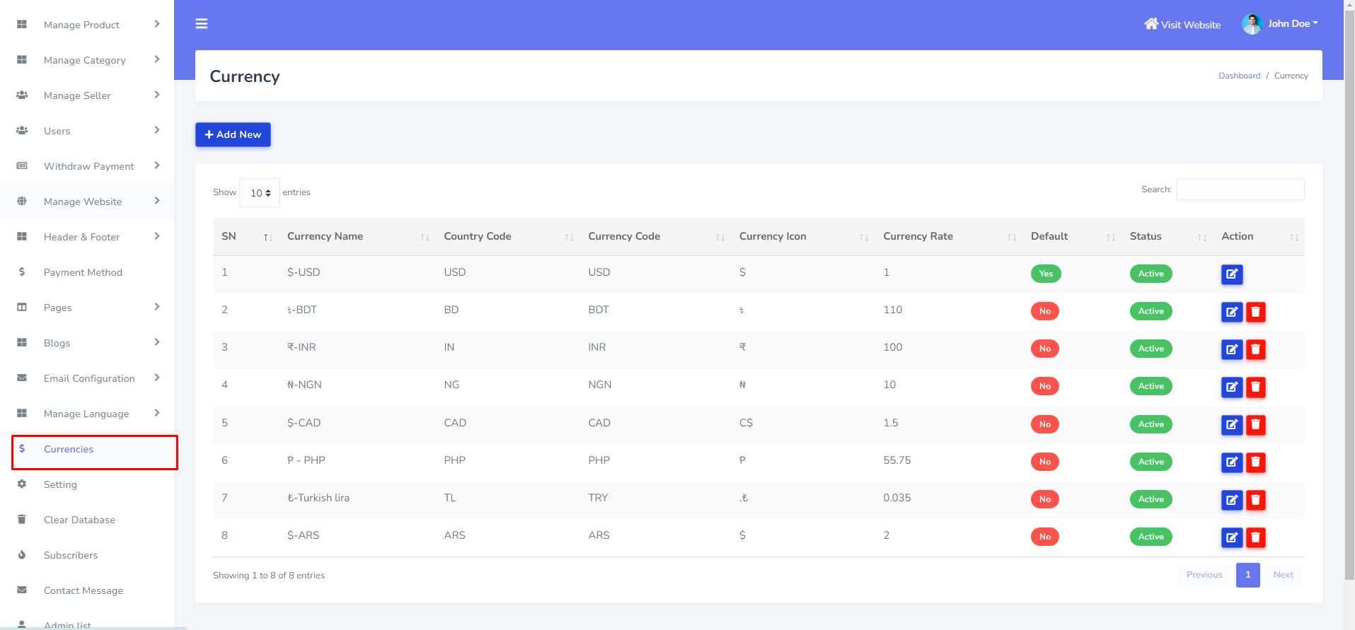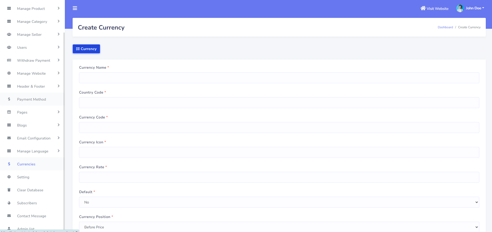Admin can be added unlimited currency with currency rate. he also able to add default currency. To create new currency go to "Currencies". see :