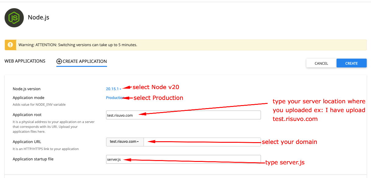 Step 6: Setup nodejs application in your server panel