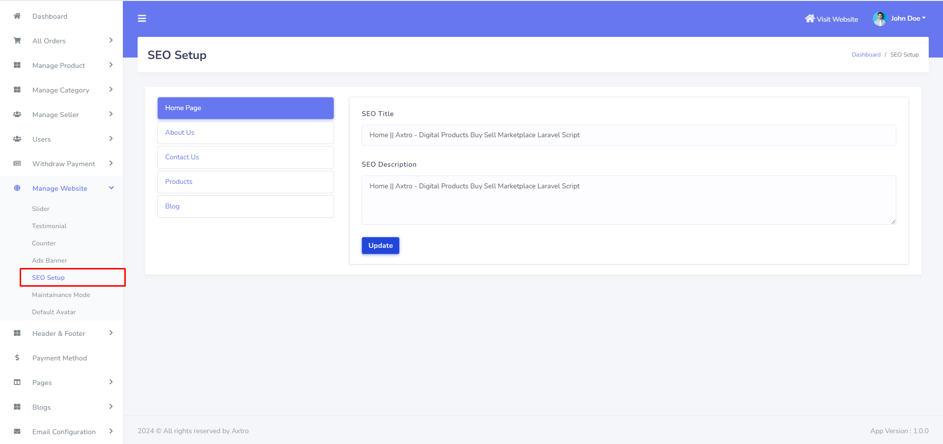 SEO setting can be setup from the admin panel. Go to "Manage Website >> SEO Setup" from sidebar. See: